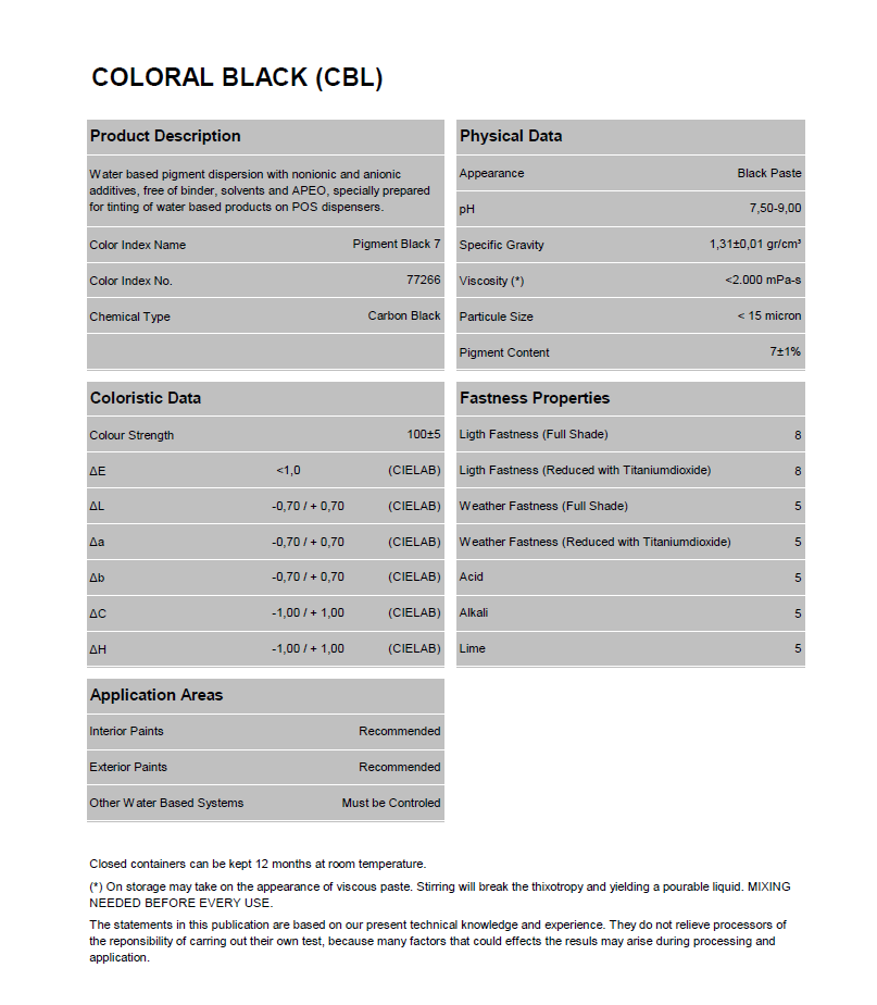 میزان مصرف COLORAL BLACK (CBL) به شدت رنگ مورد نظر و نوع فرمولاسیون پایه آب شما بستگی دارد. با توجه به محتوای رنگدانه7%، برای تعیین میزان دقیق مصرف، توصیه میشود با انجام آزمایشهای اولیه و استفاده از مقادیر کم شروع کرده و به تدریج مقدار را افزایش دهید تا به شدت رنگ مورد نظر خود دست یابید.