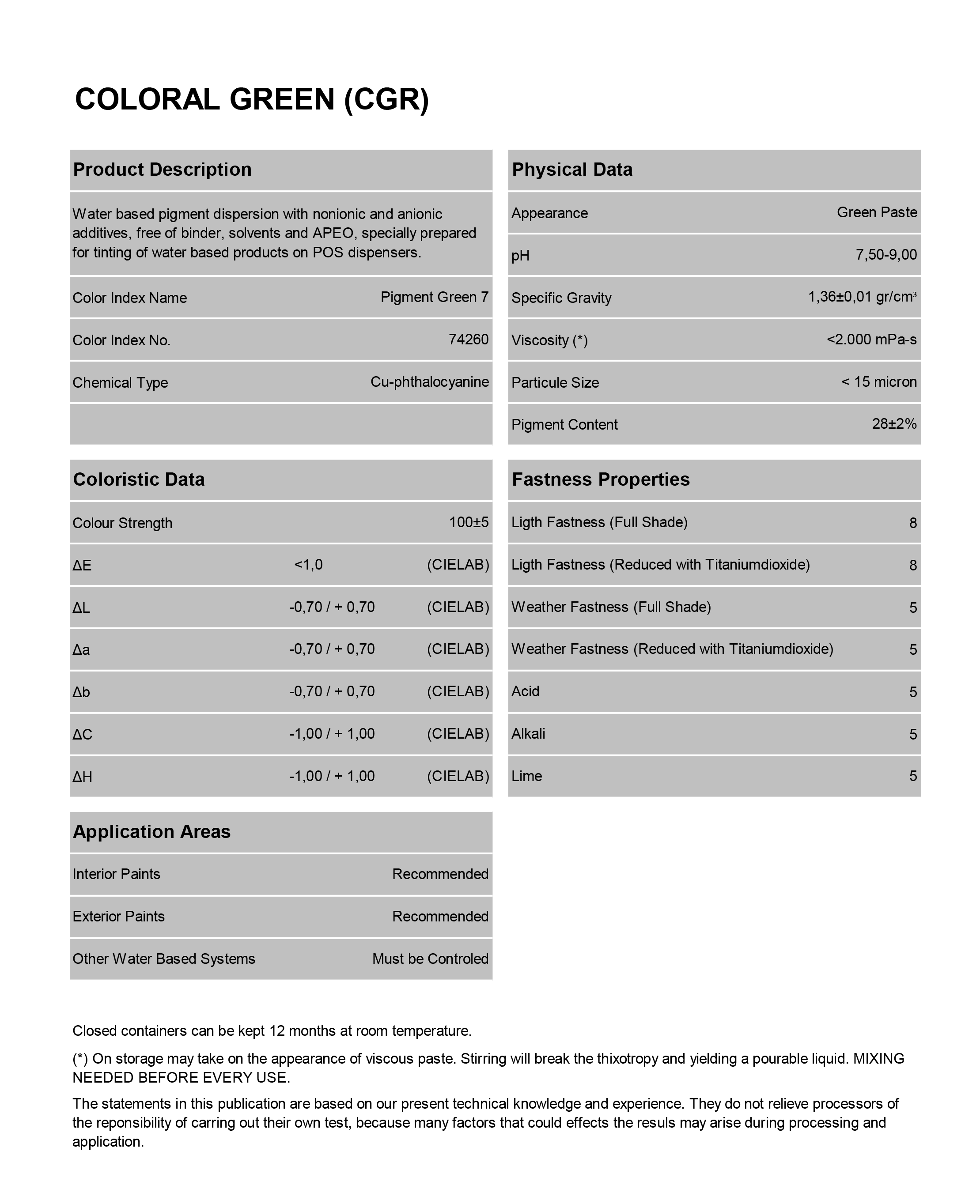 (COLORAL GREEN (CGR محصولی از شرکت SUNKEM، یک دیسپرس رنگ پایه آب با افزودنیهای غیر یونی و آنیونی است که فاقد بایندر، حلال و APEO میباشد. این محصول بهطور خاص برای رنگدهی به محصولات پایه آب در دستگاههای POS طراحی شده است و با فرمولاسیونی سازگار با محیط زیست، انتخابی ایدهآل برای تولیدکنندگان رنگهای ساختمانی و صنعتی محسوب میشود.