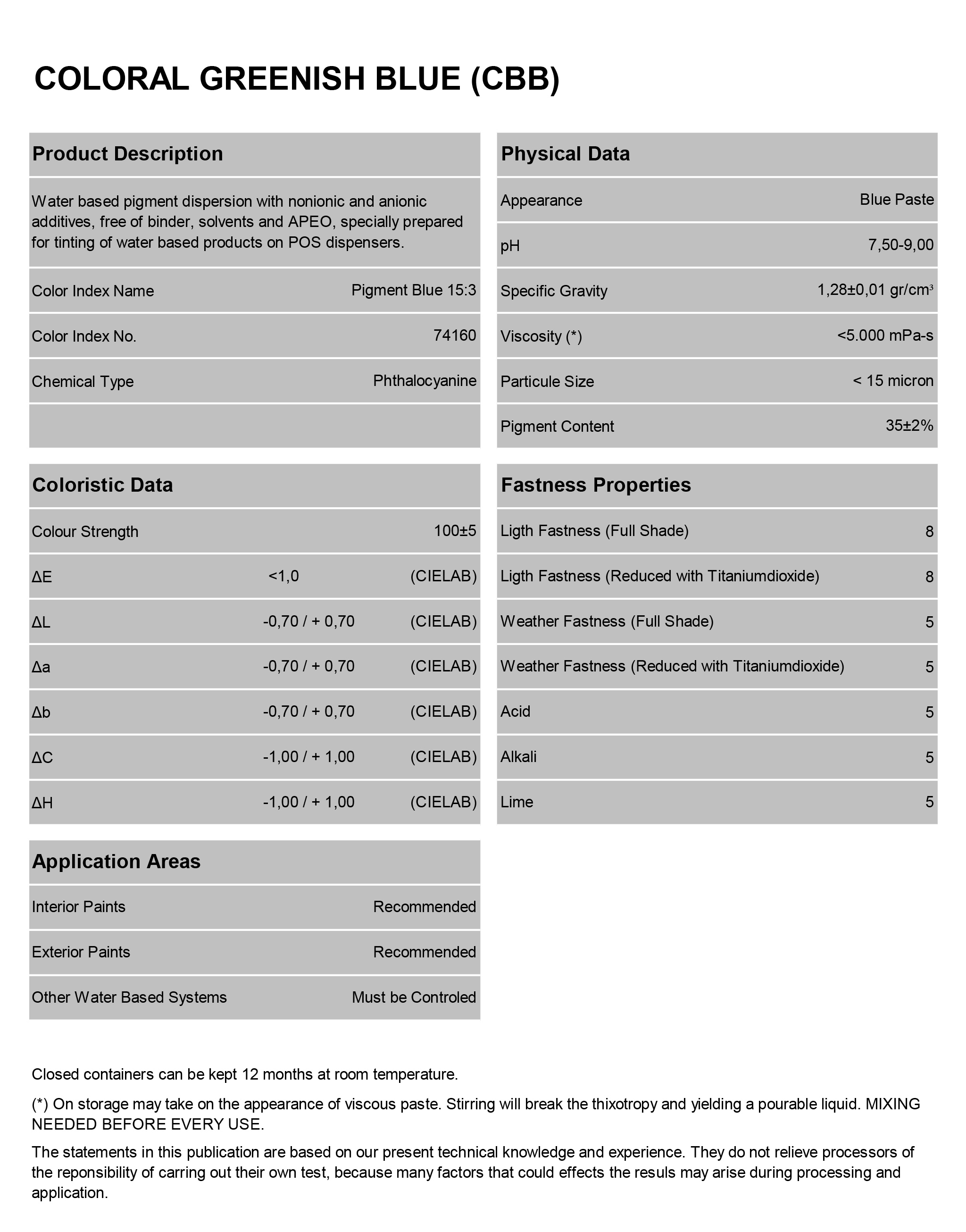 اندازه ذرات رنگدانه در این دیسپرسیون کمتر از 15 میکرون است که به یکنواختی و قدرت رنگدهی بالا کمک شایانی میکند. محتوای رنگدانه در CBB برابر با 35% است، که غلظت بالای آن را نشان میدهد و به شما امکان میدهد با مقدار کمتری از محصول، به رنگ مطلوب دست یابید.