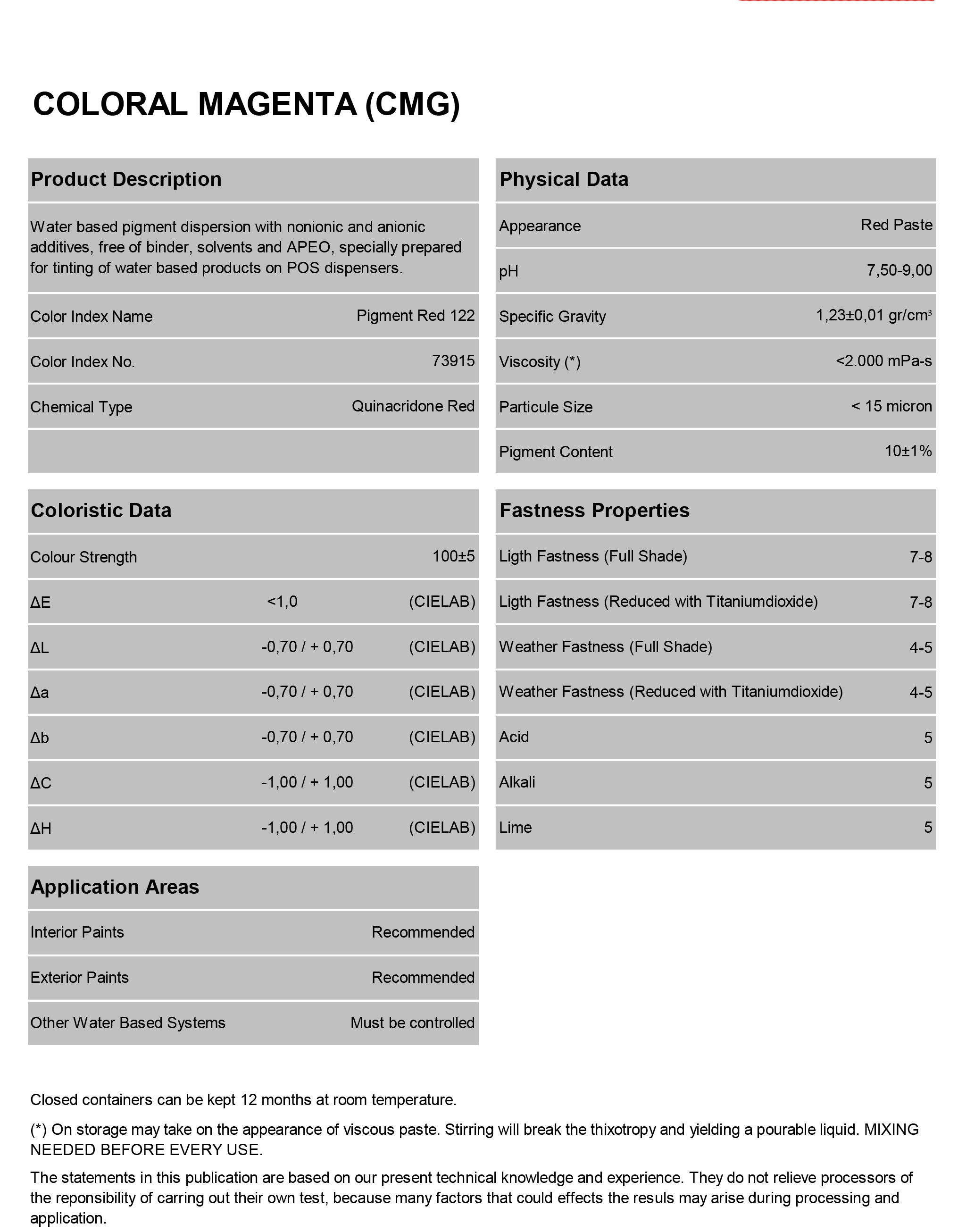 CMG یک دیسپرس رنگی بدون بایندر، بدون حلال و فاقد APEO است که با افزودنیهای غیریونی و آنیونی فرموله شده است. رنگدانه اصلی آن Pigment Red 122 از نوع کویناکریدون است که به دلیل پایداری نوری و شیمیایی بالا، در صنایع رنگسازی بسیار محبوب است. این محصول بهصورت خمیر قرمز با ویسکوزیته پایین عرضه میشود و پس از همزدن، بهراحتی قابل استفاده در سیستمهای رنگی پایه آب است.