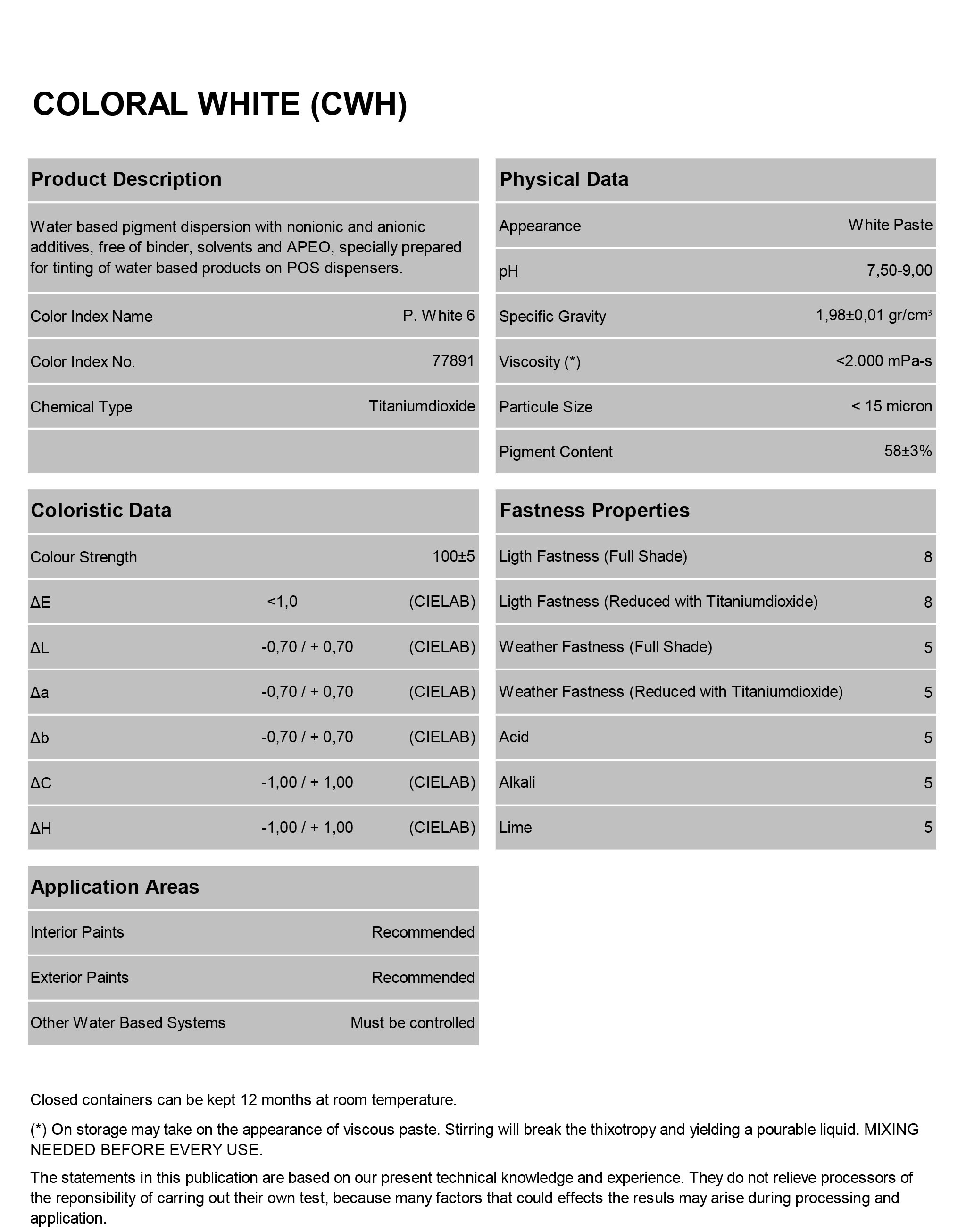COLORAL WHITE (CWH) یک دیسپرس رنگدانهای بر پایه آب با پایهای از دیاکسید تیتانیوم است که برای رنگآمیزی دقیق محصولات پایه آب طراحی شده. این محصول توسط شرکت SUNKEM ترکیه تولید شده و فاقد بایندر، حلال و APEO بوده و با استفاده از مواد افزودنی غیر یونی و آنیونی فرموله شده است.